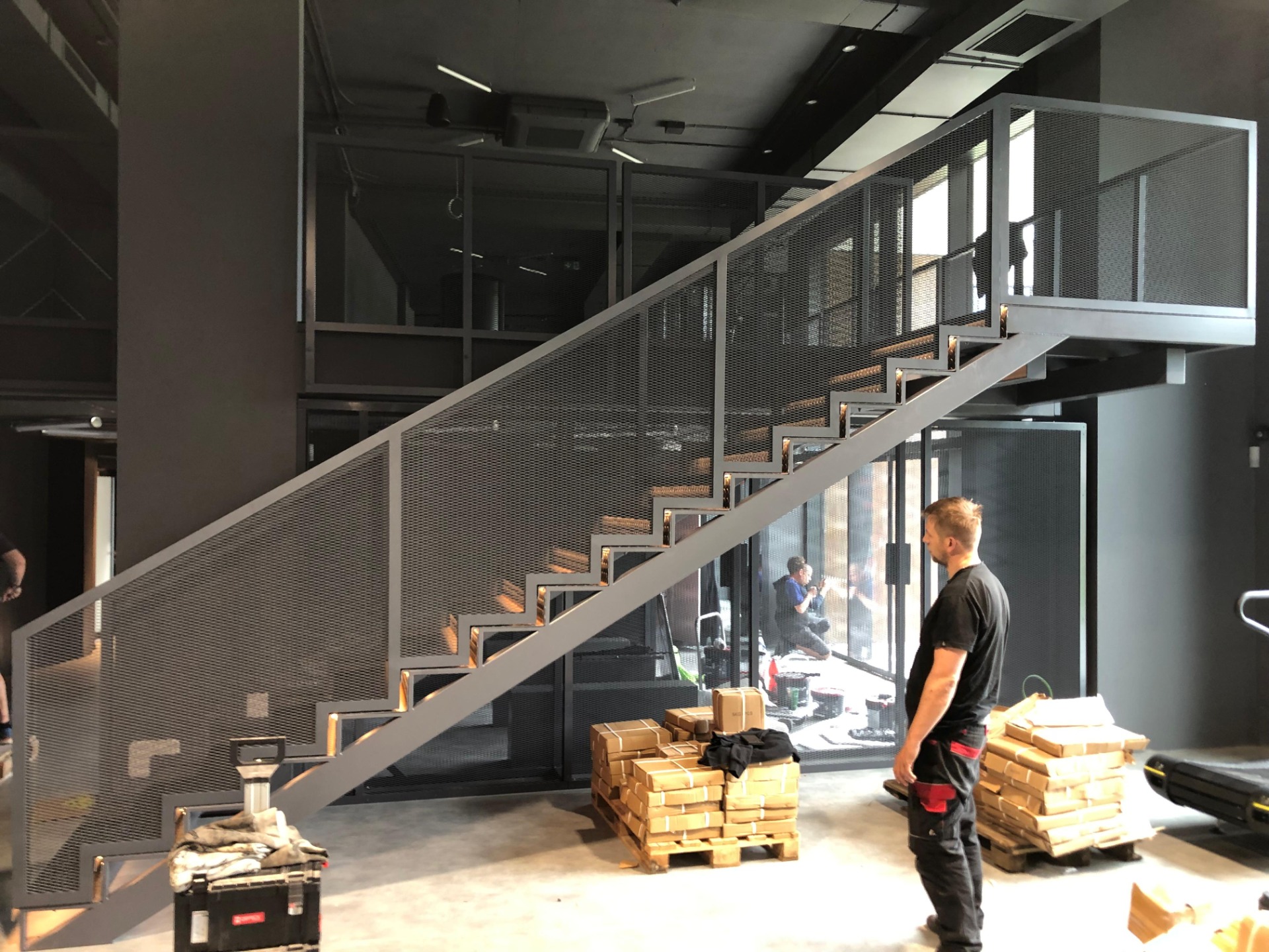 Výroba podesty, schodů a atypického kovového zábradlí do nově vznikajícího fitka v Olomouci. Tady jsme si opravdu mákli — zákazník měl jasnou představu o použití surového slzičkového plechu na schody a tahokovu na zábradlí. Nakonec vše krásně ladí, interiéru to dodalo výrazný industriální nádech a zákazník byl maximálně spokojený. My také.